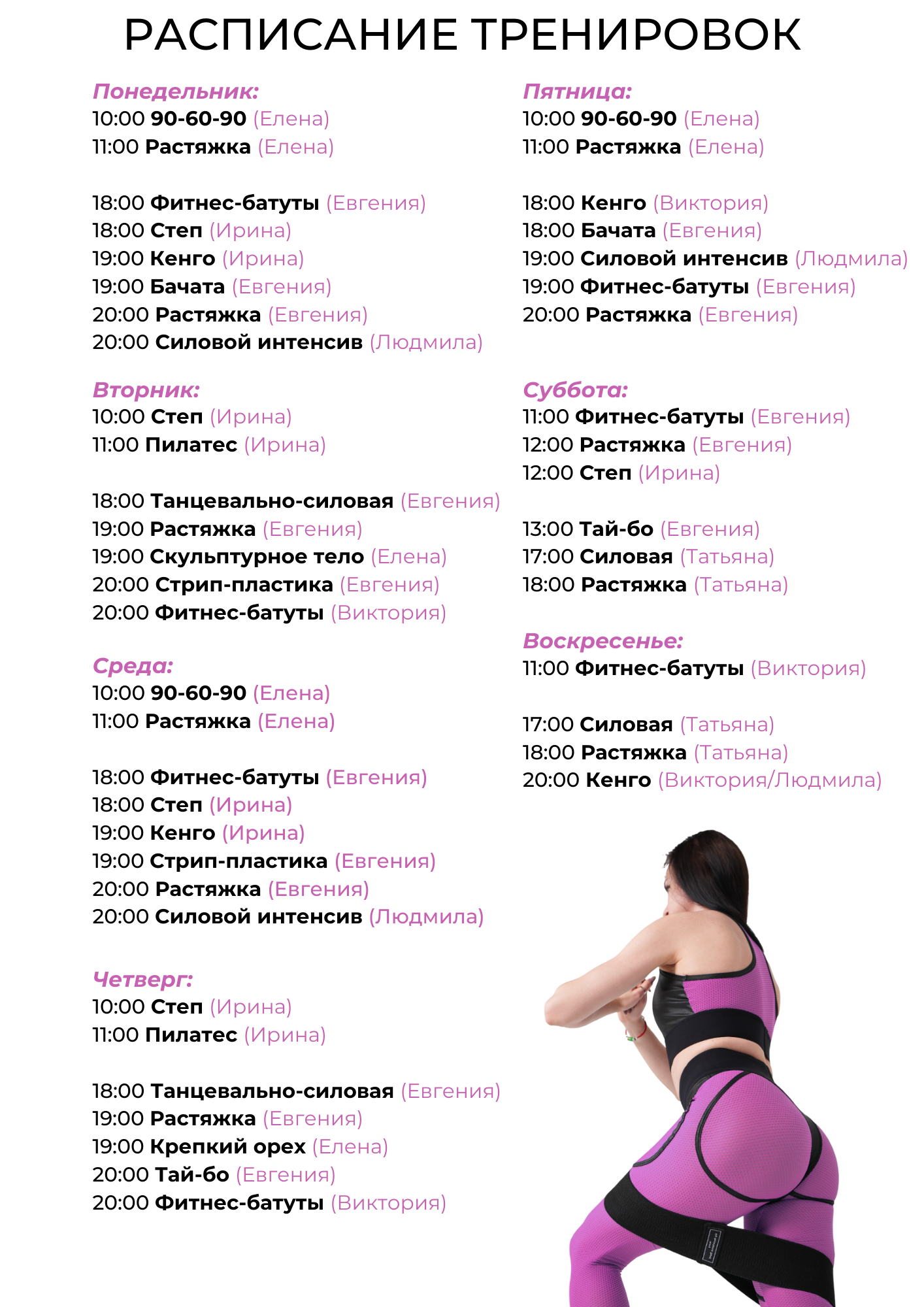 90-60-90 — это фитнес-программа, направленная на создание стройного, подтянутого тела и улучшение пропорций фигуры. Тренировка сочетает силовые упражнения и работу над основными женскими зонами: ягодицами, ногами, прессом и руками. Занятия проходят в активном темпе, используются упражнения с собственным весом, гантелями или другим оборудованием. Главная цель — укрепить мышцы, подтянуть тело и приблизиться к идеальным формам.